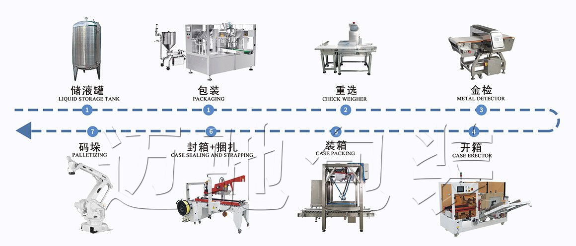 儲液罐→包裝→重選→金檢→開箱→裝箱→封箱+捆紮(zhā)→碼垛