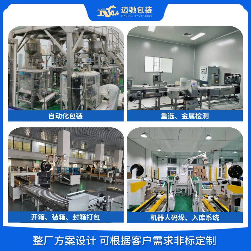 調味品包裝機的自動化包裝工藝流程:物料(liào)提升→真空上料→包裝→重選→金檢→開箱→裝箱→封箱+打包→碼垛